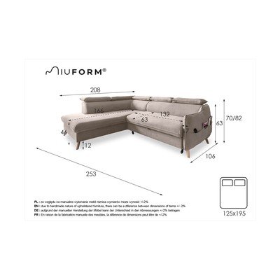 Regulējams/salokāmsAr kreiso stūri/L veidaGaiši pelēksČetrvietīgsPlatums 253 cmDziļums 208 cmSēdekļa dziļums 63 cm