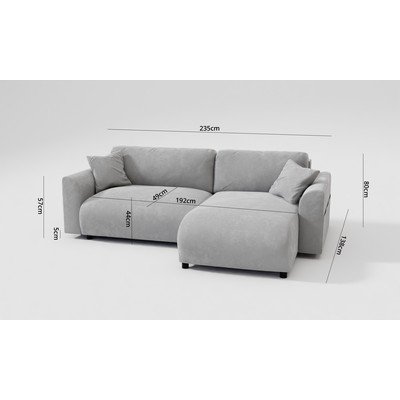 Stūra dīvāns LorineSamta, salokāms/ar uzglabāšanas vietu, ar labo stūri/ar kreiso stūri/ar maināmu stūri/ar zvilni, pelēks, trīsvietīgs, platums 235 cm
