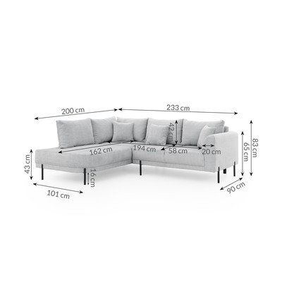No šenila audumaAr kreiso stūri/L veidaGaiši pelēksMājdzīvniekiem piemērots/pret traipiem noturīgsČetrvietīgsPlatums 233 cm
