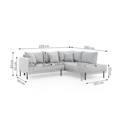 No šenila auduma, ar labo stūri/L veida, gaiši pelēks, mājdzīvniekiem piemērots/pret traipiem noturīgs, četrvietīgs, platums 233 cm