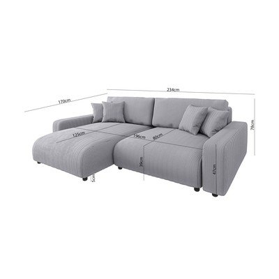 Stūra dīvāns SaraVelveta, salokāms/ar uzglabāšanas vietu, ar labo stūri/ar kreiso stūri/ar maināmu stūri/ar zvilni, gaiši pelēks, trīsvietīgs, platums 234 cm