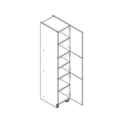 Kian virtuves pārtikas skapītī apvienota laminēta virsma, kas atgādina Artisan ozolu, un eleganta, melna dekoratīva detaļa. Tas piedāvā kopumā piecus plauktus, kas paslēpti aiz 16 mm biezām melamīna plāksnes durvīm. Pateicoties eņģēm ar Soft Closing sistēmu, to aizvēršana ir klusa un vienmērīga. Pats skapītis ir baltā krāsā un izgatavots no 16 mm bieza lamināta dēļa.