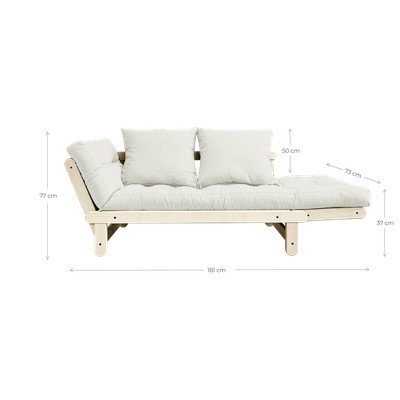 Dīvānu var novietot vairākās dažādās pozīcijās, pateicoties tā samontētajam priedes rāmim un mīkstajam futonam (kas ir krāsains matracis, kura formu un funkciju iedvesmojusi Japāna):