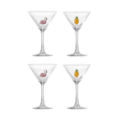 Komplektā ir divas glāzes ar flamingo motīvu un divas ar ananāsu motīvu. Katra glāze ir unikāla, pateicoties ar rokām veidotajam un izgatavotajam dizainam. Glāzes ir ideāli piemērotas kokteiļu pasniegšanai.