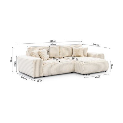 VelvetaSalokāms/ar uzglabāšanas vietuAr labo stūriKrēmkrāsasŪdensizturīgs/pret traipiem noturīgsTrīsvietīgsPlatums 255 cm