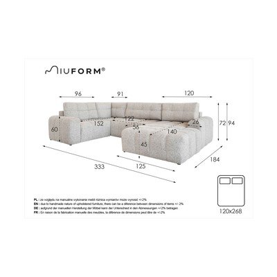 Salokāms/ar uzglabāšanas vietuAr kreiso stūriKrēmkrāsasČetrvietīgsPlatums 333 cmDziļums 213 cmSēdekļa dziļums 56 cm