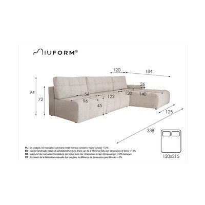 Salokāms/ar uzglabāšanas vietuAr labo stūriKrēmkrāsasTrīsvietīgsPlatums 338 cmDziļums 184 cmSēdekļa dziļums 56 cm