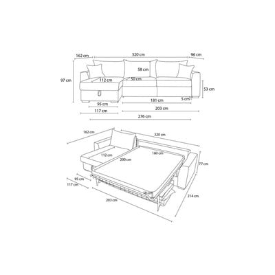 Stūra dīvāns AugustinVelveta, gulēšanai/salokāms/ar uzglabāšanas vietu, ar labo stūri/ar kreiso stūri/ar maināmu stūri/ar zvilni, krēmkrāsas, vairākvietīgs, platums 320 cm