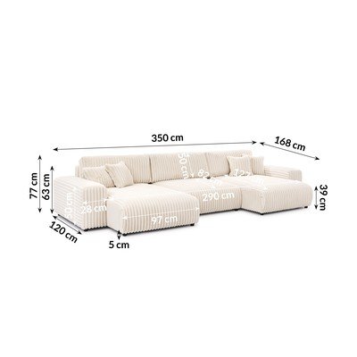 Velveta, salokāms/ar uzglabāšanas vietu, U veida, krēmkrāsas, ūdensizturīgs/pret traipiem noturīgs, vairākvietīgs, platums 350 cm
