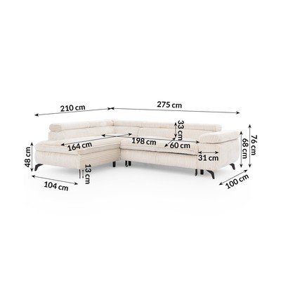 Stūra dīvāns MarbeyaVelveta, regulējams/salokāms/ar uzglabāšanas vietu, ar kreiso stūri/L veida, krēmkrāsas, mājdzīvniekiem piemērots/pret traipiem noturīgs, četrvietīgs, platums 275 cm