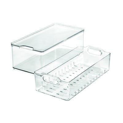 iDesign/The Home Edit modulārais ledusskapja organizators ir izgatavots no īpaši izturīgas plastmasas. Tajā ir iekļauts paliktnis, ko var izmantot arī atsevišķi. Tam ir noņemams vāks.