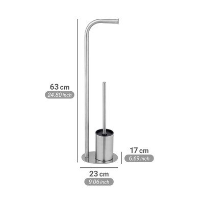 Šis brīvi stāvošais tērauda aksesuārs eleganti apvieno tualetes papīra turētāju ar iebūvētu tualetes birsti. Birste ir ievietota atsevišķā konteinerī statīva pamatnē, un tās galviņas diametrs ir 7,5 cm.