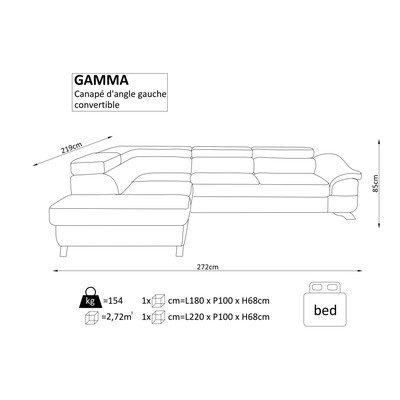 Salokāms, melns, platums 219 cm, sēdekļa dziļums 57 cm