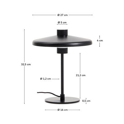 Kave Home galda lampa Nuvira pārsteidz ar savu eleganto un funkcionālo dizainu. Tās matētā tērauda konstrukcija piešķir jebkurai telpai modernu un izsmalcinātu izskatu. Lampai ir raksturīgs plakans apaļš abažūrs un slaids statīvs ar apaļu pamatni.