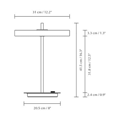 UMAGE galda lampa Asteria Table ar regulējamu apgaismojumu apvieno eleganci un funkcionalitāti. Melno metāla abažūru papildina misiņa elements, kas iet caur tā centru. Lampa ir aprīkota ar integrētu LED paneli ar izkliedētāju, kas nodrošina patīkamu, maigu apgaismojumu. Lampā ir iebūvēta USB pieslēgvieta tālruņa uzlādei, ko var izmantot arī tad, kad gaisma ir izslēgta.