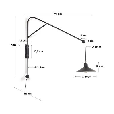 Kave Home sienas lampa Eleazar ir izgatavota no metāla ar melnu apdari. Gaismeklim ir grozāma kāja un abažūrs ar regulējamu augstumu. Apgaismojumam ieteicams izmantot LED spuldzi ar E27 pamatni un jaudu līdz 25 W (nav iekļauta komplektā).
