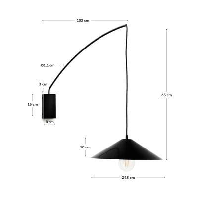 Kave Home sienas lampa Kally ir ideāls aksesuārs tiem, kas meklē oriģinālu un stilīgu apgaismojumu. Lampa ir izgatavota no metāla un pārsteidz ar sava neparasto konusveida abažūru, kas iekārts uz auduma piekares. Lietošanai ir jāiegādājas spuldze ar E27 pamatni, kuras maksimālā jauda ir 40 W.