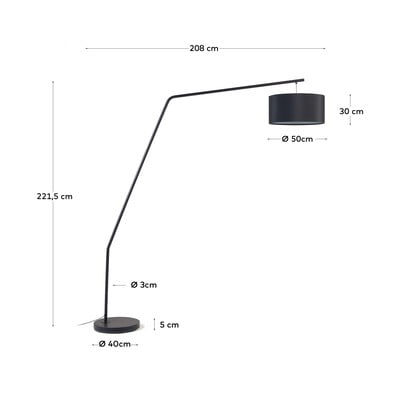 Kave Home Ciana stāvlampa ir izgatavota no metāla ar melnu apdari. Lampai ir vienkāršs moderns dizains ar garu kāju un apaļu auduma abažūru. Ja laika gaitā vēlaties pārmaiņas, abažūru var viegli nomainīt pret citu. Lampa ir saderīga ar E27 spuldzēm ar maksimālo jaudu 32 W.