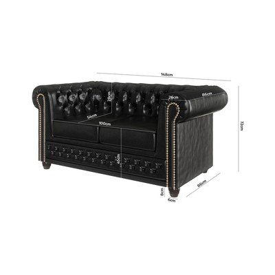 Dīvāns YorkNo ādas imitācijas, gulēšanai/salokāms, Chesterfield, melns, ūdensizturīgs/mājdzīvniekiem piemērots/pret traipiem noturīgs, divvietīgs, platums 148 cm