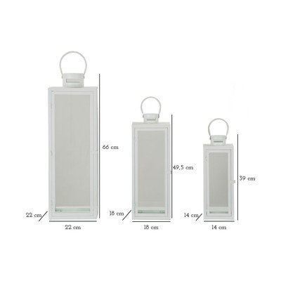 Katras laternas izmēri ir 22 x 22 x 66 cm, 18 x 18 x 49,5 cm un 14 x 14 x 39 cm.