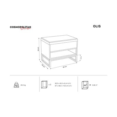 Olis plaukts apvieno atklātu un slēgtu glabāšanas telpu. Šo dizaina un funkcionālo mēbeļu kombināciju papildina metāla pamatne, kas kumodei piešķir modernu izskatu. Jūs varat to viegli pieskaņot savam interjeram.