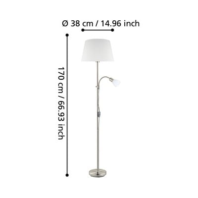 Skaista lampa dīvāna stūrī. Ir norādīts, ka abažūrs ir pelēks, taču tas ir balts.