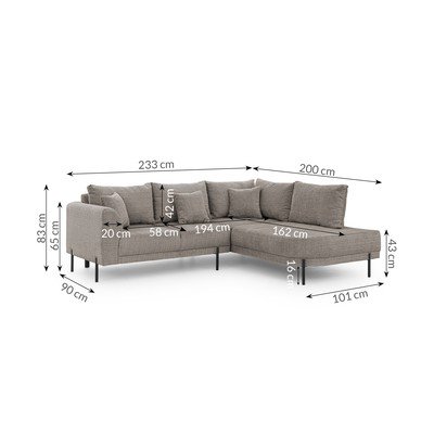 No šenila auduma, ar labo stūri/L veida, pelēkbrūns, mājdzīvniekiem piemērots/pret traipiem noturīgs, četrvietīgs, platums 233 cm