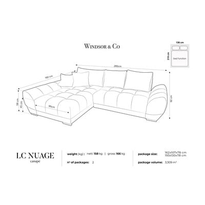 Stūra dīvāns NuageSamta, salokāms/ar uzglabāšanas vietu, ar kreiso stūri/ar zvilni, pelēks, ūdensizturīgs/pret traipiem noturīgs, četrvietīgs, platums 285 cm