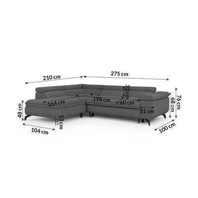 No šenila auduma, regulējams/salokāms/ar uzglabāšanas vietu, ar kreiso stūri/L veida, pelēks, mājdzīvniekiem piemērots/pret traipiem noturīgs, četrvietīgs, platums 275 cm