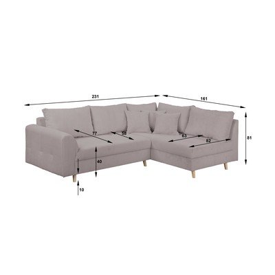 Velveta, ar labo stūri/L veida, pelēks, trīsvietīgs, platums 231 cm