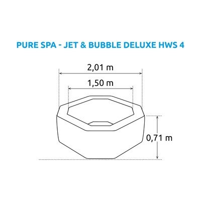 Komplektā atradīsiet arī divus apakšgaldiņus, termoizolācijas vāku, sildītāju, filtrēšanas sistēmu, sūkņa uzgali, trīs filtrēšanas ieliktņus, izolācijas spilventiņu, piepūšanas šļūteni, maisiņu, hlora, pH un sārmainības testeri un 5 m kabeli. Karstā baļļa nav savienojama ar saules sildītāju, hloratoru vai smilšu filtru.