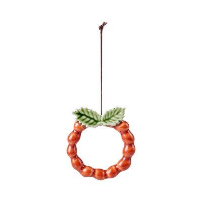 Keramiskais Ziemassvētku rotājums ar zaļu matētu glazūru ir veidots Ziemassvēku vainaga formā.