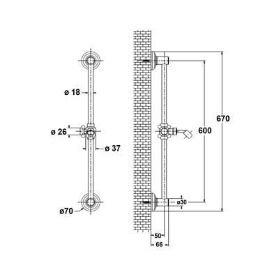 Šim dušas stienim (garums 67 cm, ieskaitot vāciņus) ir bīdāms rokas dušas turētājs. Montāžas skrūvju attālums ir 60 cm.