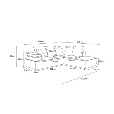 No šenila auduma, ar kreiso stūri/L veida, rozā, četrvietīgs, platums 273 cm