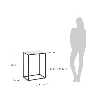 Sānu galdiņš Rewena no zīmola Kave Home ir izstrādāts, domājot par praktiskumu un izturību. Tā virsma ir izgatavota no porcelāna, kas izceļas ar augstu noturību pret šķidrumiem, augstām temperatūrām un nodilumu. Kā redzams attēlā, virsmu rotā smalks raksts, kas atgādina marmoru.