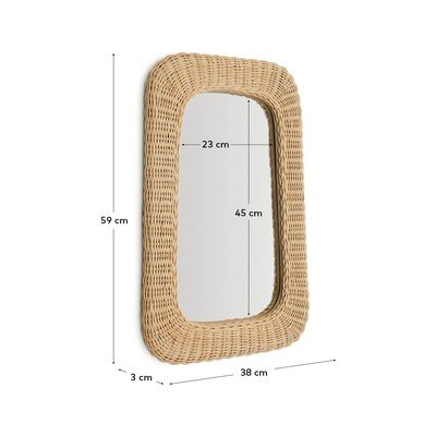 Kave Home sienas spogulis Zilna var lepoties ar aptverošu dizainu un rotangpalmas detaļām, kas jebkurai telpai piešķir siltumu un tekstūru.