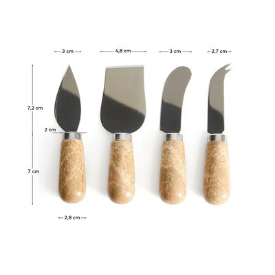 Zīmola Kave Home siera nažu komplekts Adoma ir izsmalcināts un pārlaicīgs papildinājums jūsu virtuvei. Šis četru nažu komplekts nodrošinās funkcionalitāti un stilu, piedāvājot dažādas asmeņu formas dažādiem siera veidiem. Katrs no šiem nažiem ir izgatavots no marmora un nerūsējošā tērauda, kas piešķir tiem mūsdienīgu eleganci. Marmors ir pazīstams ar savu izturību un unikālajiem rakstiem, padarot katru piederumu īpašu ar savu individuālo tekstūru un toni.