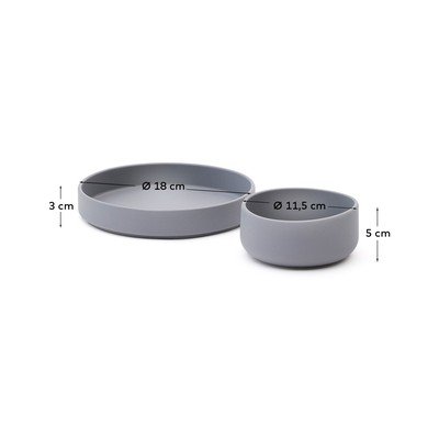 Komplektā ir divas daļas – viens plakans šķīvis un viens trauks.