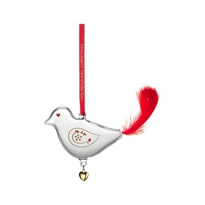 Šis stikla putns ir izgatavots no pūsta stikla, kas garantē tā unikalitāti. To rotā sarkana sirsniņa acs vietā, zelta sirsniņas uz ķermeņa, īsta sarkana spalviņa kā aste un mazs zeltīts piekariņš sirds formā, kas karājas apakšā. Komplektā ir pievienota arī zīda lentīte, lai rotājumu varētu piekarināt uz koka, logā vai uz skujkoku zariem. Tas skaisti papildinās citus nostalģiskās Ziemassvētku kolekcijas rotājumus. Ann-Sofi Romme savu Ziemassvētku kolekciju Holmegaard veido kopš 1993. gada, un katrs no tiem sniedz oriģinālu Ziemassvētku stāstu, kas daudziem atmodina prieku un atmiņas par romantiskiem Ziemassvētku brīžiem.