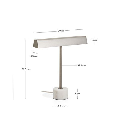 Tās virsma ir izgatavota no slīpēta metāla, kas tai piešķir izsmalcinātu un modernu izskatu, kas viegli iederēsies jebkurā interjerā. Marmora pamatne nodrošina stabilitāti un ekskluzivitāti, jo katram gabalam ir unikāls raksts un toņi, padarot katru lampu oriģinālu.