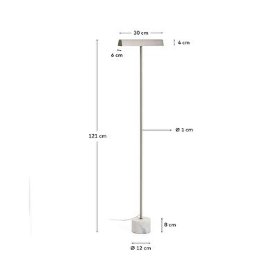Tās augšējā daļa ir izgatavota no slīpēta metāla, piešķirot tai izsmalcinātu un modernu izskatu, kas viegli iederēsies jebkurā interjerā. Lampas stabilitāti un ekskluzivitāti nodrošina marmora pamatne. Katram marmora gabalam ir unikāls raksts un toņi, padarot katru lampu par oriģinālu.