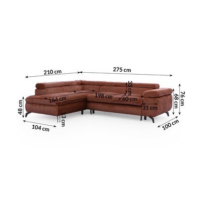 Stūra dīvāns MarbeyaVelveta, regulējams/salokāms/ar uzglabāšanas vietu, ar kreiso stūri/L veida, terakotas oranžs, mājdzīvniekiem piemērots/pret traipiem noturīgs, četrvietīgs, platums 275 cm
