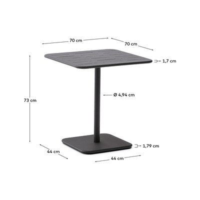 Dārza ēdamgalds Brai no zīmola Kave Home ir praktisks un stilīgs papildinājums jūsu mājoklim un dārzam. Tā kvadrātveida virsma ar gareniskām rievām balstās uz stabilas centrālās kājas un pamatnes.