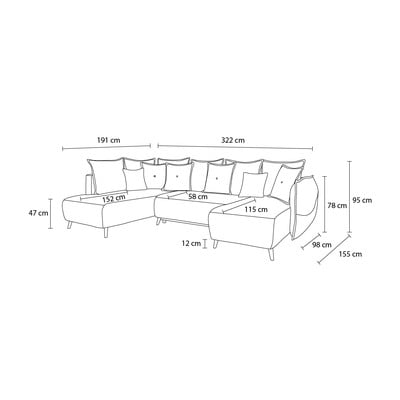 Salokāms/ar uzglabāšanas vietuU veidaTirkīzzilsVairākvietīgsPlatums 322 cmDziļums 191 cmSēdekļa dziļums 58 cm