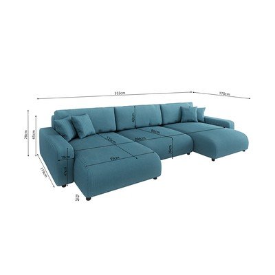Velveta, salokāms/ar uzglabāšanas vietu, U veida, tirkīzzils, vairākvietīgs, platums 332 cm
