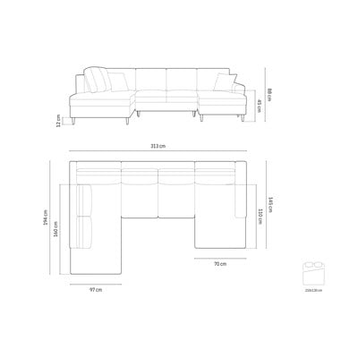 Samta, salokāms/ar uzglabāšanas vietu, ar kreiso stūri/U veida, tumši pelēks, vairākvietīgs, platums 313 cm