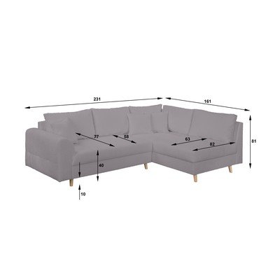 No buklē auduma, ar labo stūri/L veida, pelēks, trīsvietīgs, platums 231 cm