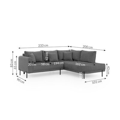 No šenila auduma, ar labo stūri/L veida, tumši pelēks, mājdzīvniekiem piemērots/pret traipiem noturīgs, četrvietīgs, platums 233 cm