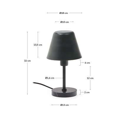 Kave Home galda lampa Calina ir izgatavota no tumši zaļa metāla ar melnu marmora pamatni. Lampa ir saderīga ar E27 spuldzi ar maksimālo jaudu 25 W. Spuldze nav iekļauta komplektā.