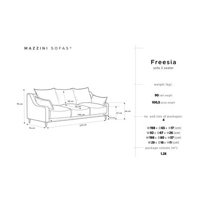 "Mazzini Sofas Freesia" dīvāns ir aprīkots ar koka un skaidu plātnes konstrukciju, kas spēj izturēt līdz pat 350 kg! Turklāt tā augstas kvalitātes mīkstais putu pildījums nodrošina maksimālu komfortu.